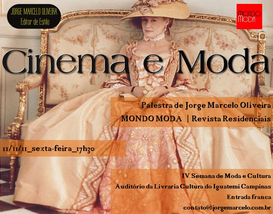 O jornalista e editor de estilo Jorge Marcelo Oliveira ministrará a palestra Cinema e Moda, sexta-feira, 11 de novembro, às 17h30, no Auditório da Livraria Cultura, do Shopping Iguatemi Campinas. A palestra integra IV Semana de Moda e Cultura, organizado pela professora e escritora Maria Alice Ximenes.