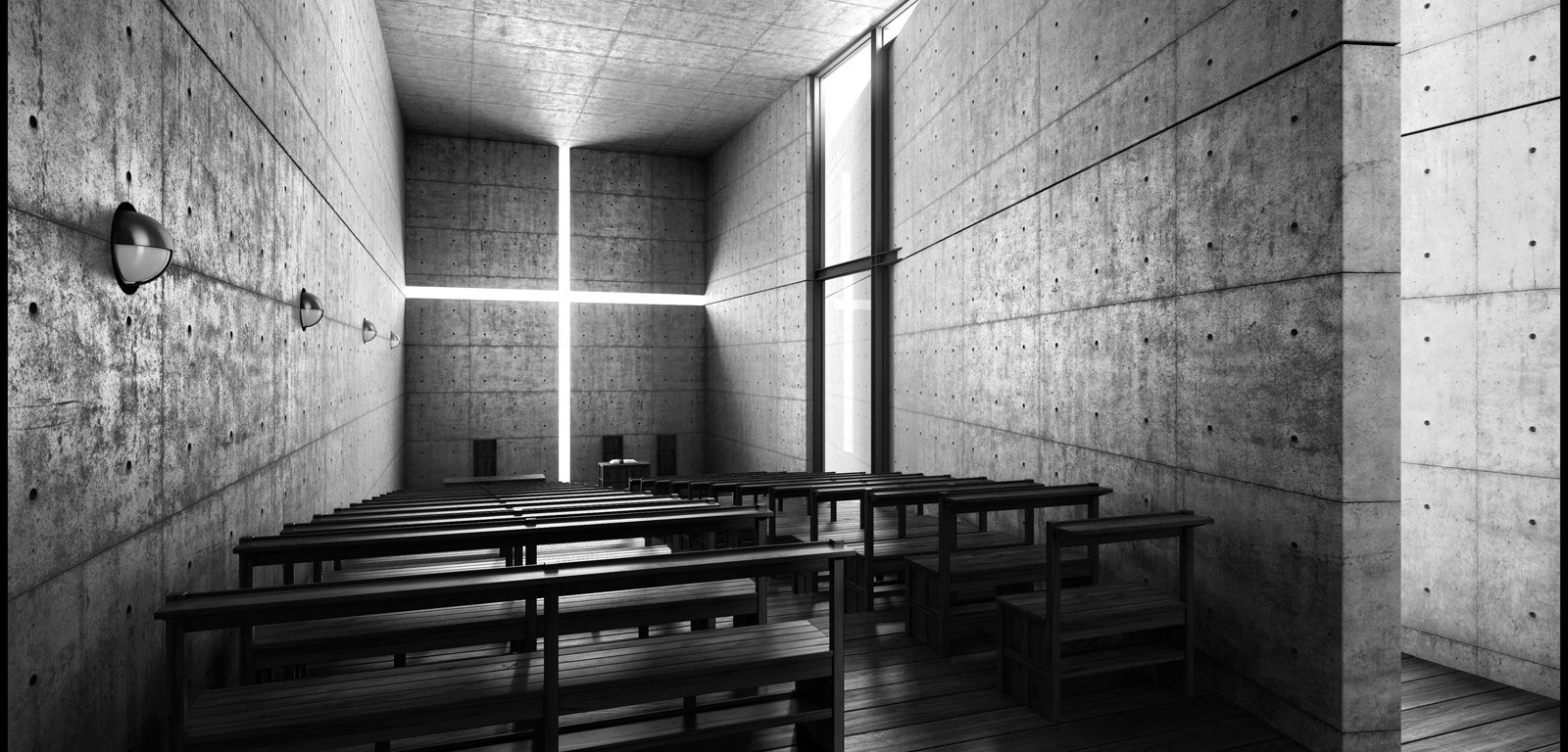Na pequena cidade de Ibaraki, no Japão, a Church of Light (Igreja da Luz) é uma obra simples e pura com fendas cuidadosamente alinhadas e jogos de luz e sombra na profundidade, onde se localizaria um altar nas construções tradicionais, uma fenda em formato de cruz cria a identidade ecumênica. É o jogo entre cheios / vazios, luz / movimento, escuro / serenidade, que dá sentido à proposta deste arquiteto japonês. A obra se incorpora à natureza que é sutilmente emoldurada pelas fendas que funcionam também como “janelas”, e recebem a luz natural de forma controlada, simbolizando aproximação espiritual. Materiais simples como concretos e vidro foram cuidadosamente e harmonicamente empregados, assim como na obra a seguir.