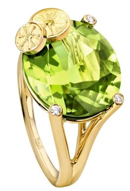 O anel Tutti Green em ouro amarelo 18K é realçado por uma pedra perídoto em corte oval. Dois diamantes na cor amarela ganham o desenho de limões e três brilhantes decoram a joia.