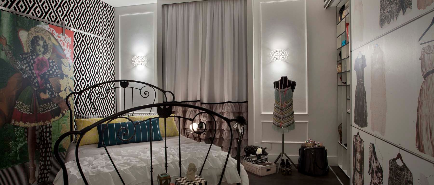 4) SUÍTE DA ESTUDANTE DE MODA – Kátia El Badouy – Tem ambientes que parecem que não poderiam ter sido feitos por outra pessoa. E, na minha visão, esse é um exemplo. Para quem conhece a profissional sabe que ela tem senso e estilo para moda, veste-se muito bem e isso se reflete no ambiente. Quem conhece um pouco desse universo também se delicia com os detalhes de ícones fashion como a estampa pied-de-poule consagrada por Chanel e o fantástico pattern de caveiras do McQueen. Destaca-se o contraste da composição monocromática marcante do preto e branco com elementos femininos e românticos presentes em detalhes como as linhas curvas da cama e o desenho primoroso da roupa de cama e cortina.