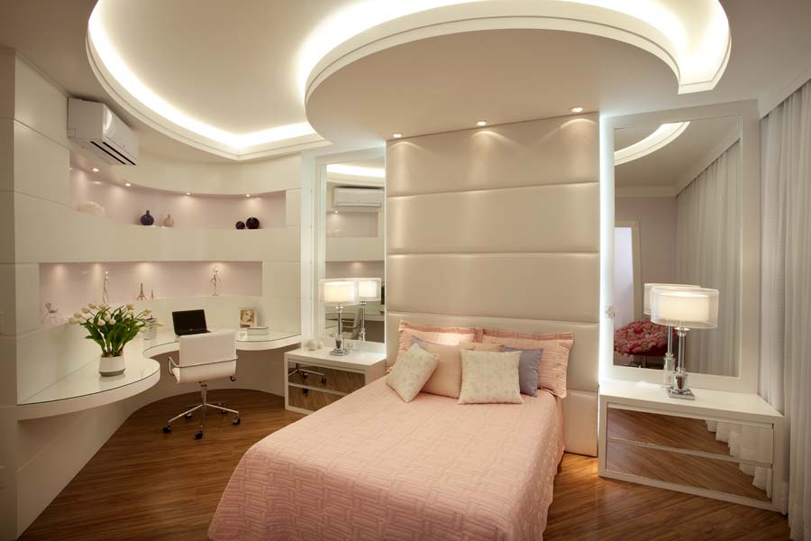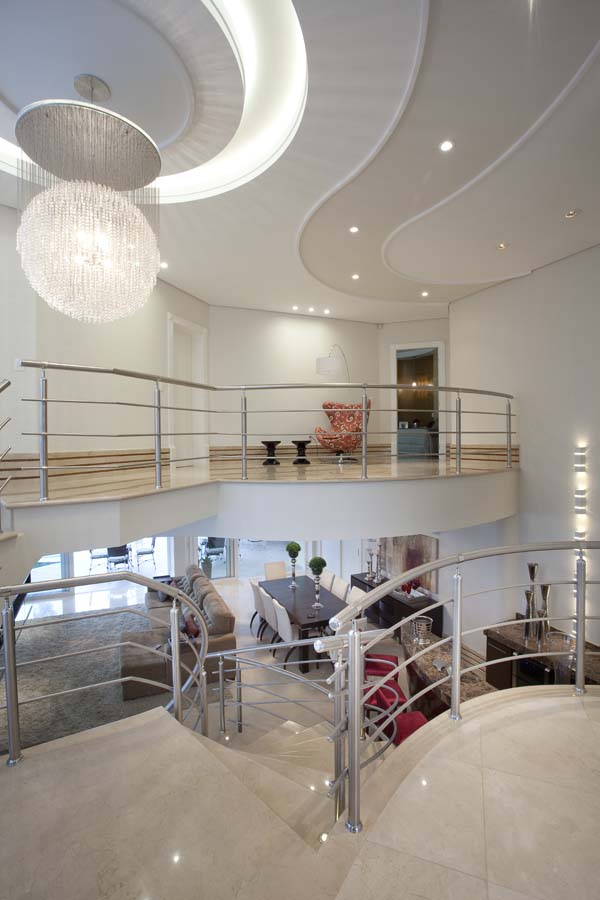 O material também é um poderoso aliado para simular frisos na parede, inclusive em banheiros e lavabos. Seu uso em projetos luminotécnicos valoriza os ambientes, pois os forros rebaixados permitem que sejam embutidos pontos de luz e realizado o efeito da luz indireta. Em alguns casos, criamos clarabóias com vitrais, ou vidros jateados e usamos iluminação artificial para que o teto ganhe maior destaque.