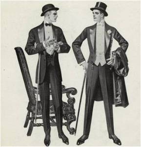 09.Exemplo de roupas para o dia e a noite. Nota-se a variação na altura das costas do terno e o trabalho em seda na lapela. A cartola reservada para noite. – B.Kuppenheimmer ando Co. Chicago, 1912