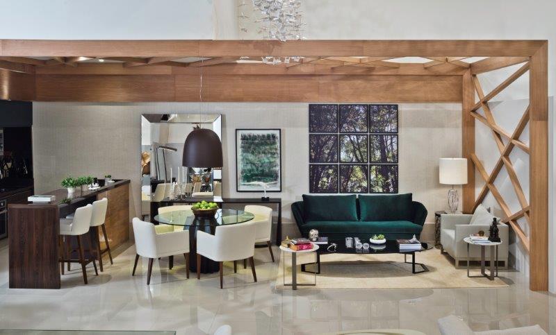 As tonalidades neutras – variando do bege ao marrom e a madeira – fazem contraponto ao destaque do ambiente, o sofá em veludo verde. A madeira natural encontrada no balcão, paredes e pergolado traz a natureza para perto do homem. Um dos destaques é o conjunto de 10 fotografias em metracrilato de diferentes árvores.
