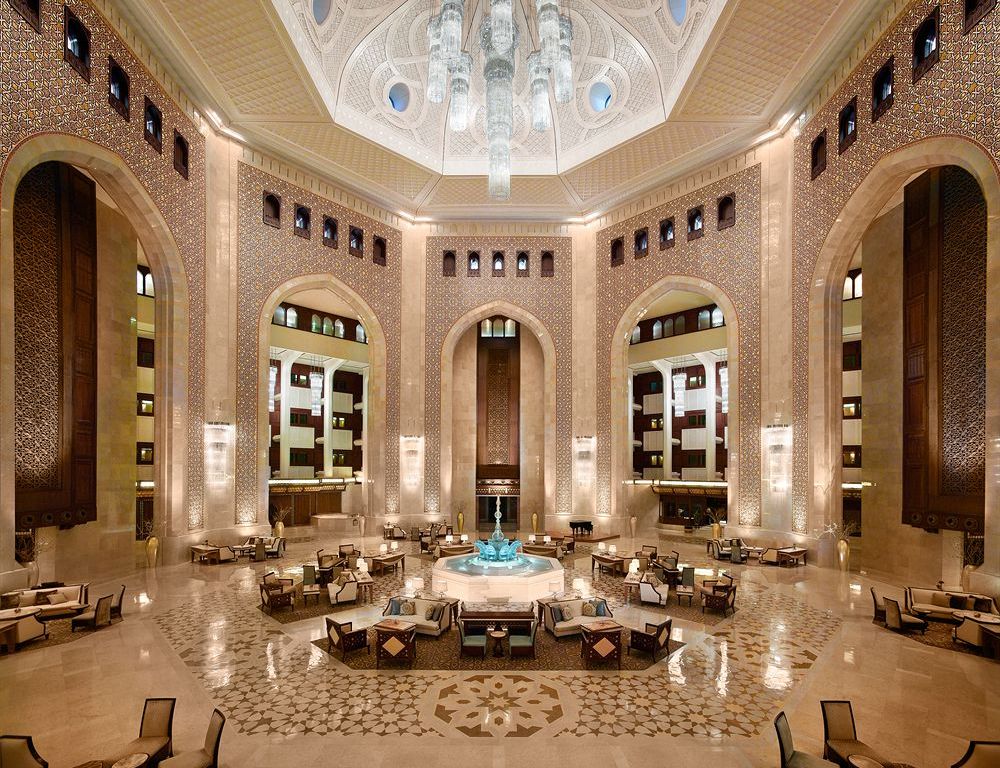 Com um pé direito de 39 metros e um lustre com 5.5 toneladas de cristais, o lobby do All Bustan Palace, atual Ritz Carlton Hotel, em Mascate, Omã (Emirados Árabes) impressiona. É a sensação de entrar num palácio das mil e umas noites dos contos árabes.