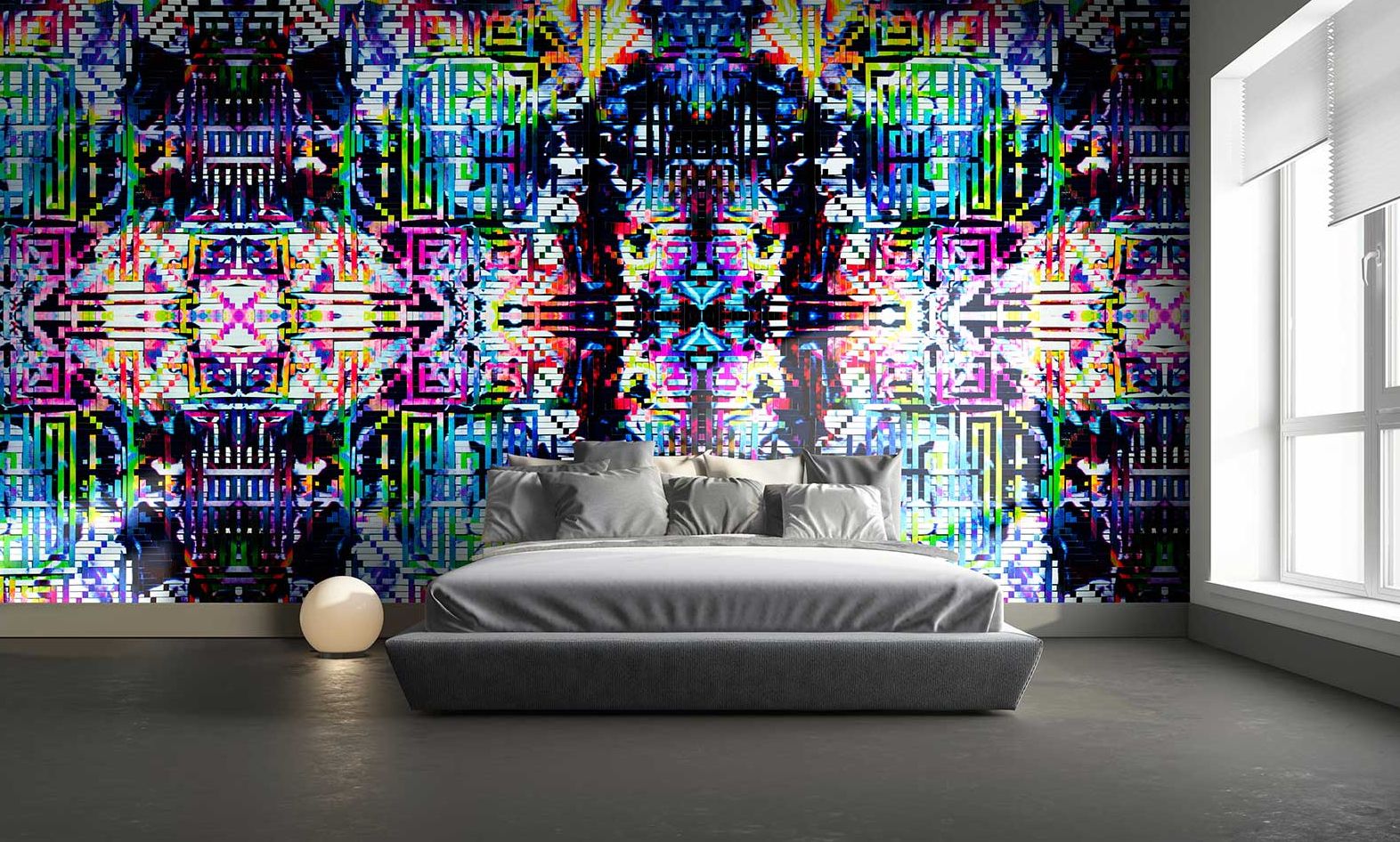 As paredes do estúdio de Lala são revestidas pela tapeçaria caleidoscópica da coleção Metaverse.