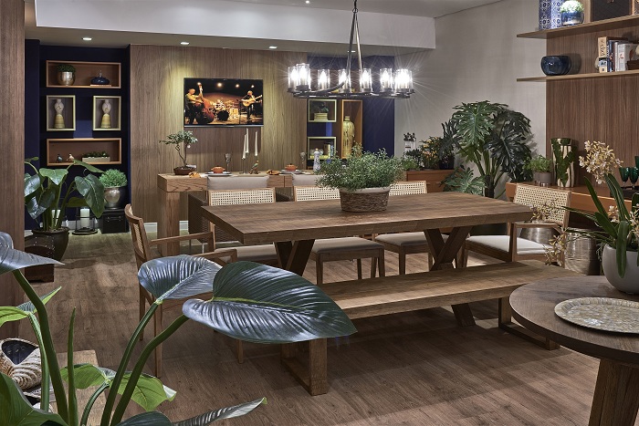 Rústico e Elegante – O clima rústico da casa de campo foi a inspiração de Luciana Teixeira Steccini para seu ambiente na Decora Lider Ribeirão Preto. A madeira em suas diferentes versões foi o material escolhido para permear o ambiente, seja nos móveis, seja nos painéis que cobrem as paredes. O destaque é para a mesa de jantar, rodeada pelas cadeiras Aurora e pelo banco Ekos em uma de suas laterais, ideal para encontros de fim de semana com família e amigos. Ao fundo, a bancada que dá acesso à cozinha integra os espaços, recebe as cadeiras Plena e não deixa o chef da família cozinhando sozinho.