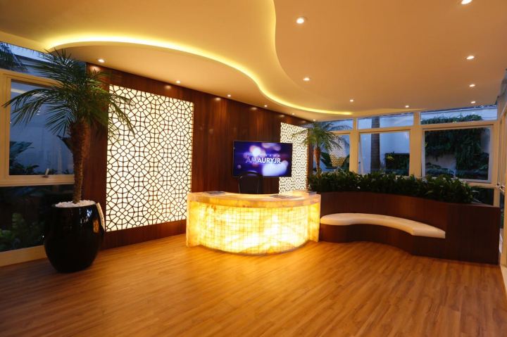 O resultado é um ambiente leve, mas com ar de nobreza. As linhas curvas estão presentes na bancada de entrevista em ônix iluminado e no teto (também iluminado), com uma grande linha curva que proporciona energia ao ambiente. A composição ainda conta com bar e chopeira e cobogós retro iluminados feitos com desenho exclusivo para o projeto. A madeira e o mármore conferem um ar de simplicidade e nobreza.
