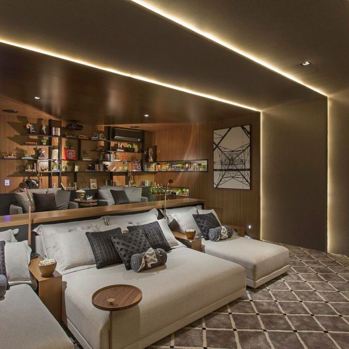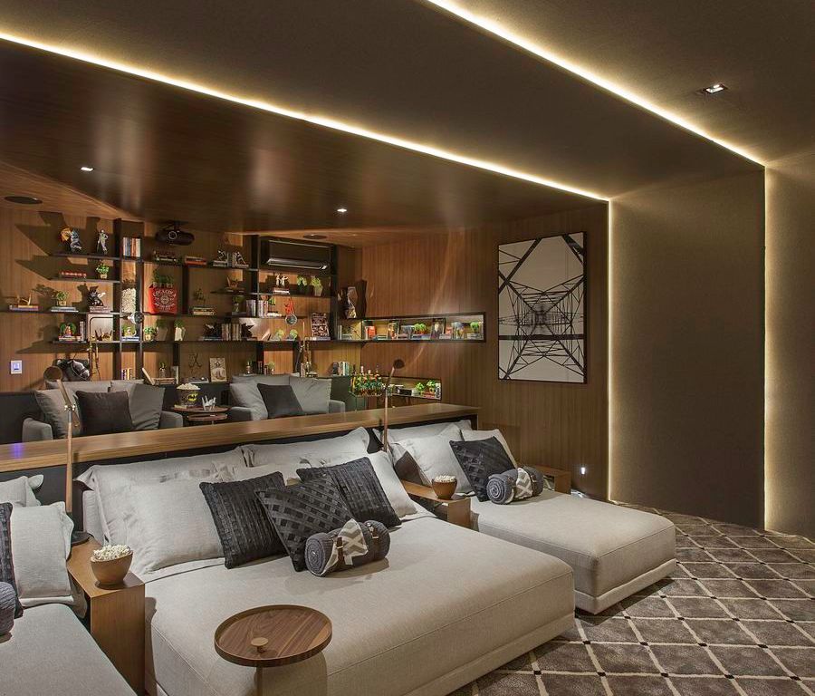 As designers de interiores Nilza Alves e Rita Diniz, que estiveram presentes em todas as edições da Campinas Decor, idealizaram um ambiente de cinema com 43 m2, voltado para uma residência. Nesse espaço elas ofereceram os melhores e mais modernos equipamentos já desenvolvidos. A partir disso, criaram diferenciais em iluminação, revestimentos e layout de mobiliário para a família e amigos desfrutarem momentos prazerosos. O grande destaque do projeto é o forro e paredes iluminados e revestidos com espuma e tecido para obter uma boa acústica. Também foi aplicado MDF amadeirado nas paredes para criar uma atmosfera moderna e aconchegante junto à marcenaria. No piso, as profissionais usaram carpete de nylon com estampa exclusiva em tons cinza e preto e nas paredes tecido grafite. Nas poltronas foram colocados sensores que vibram de acordo com o som e imagem dos filmes. Foi instalada no espaço uma rampa de acesso para atender às normas e criado espaço de bar e computador com nichos para guardar filmes e livros. A iluminação é indireta e bem projetada para manter o equilíbrio dos revestimentos escuros nas paredes e teto, sem prejudicar a imagem projetada.