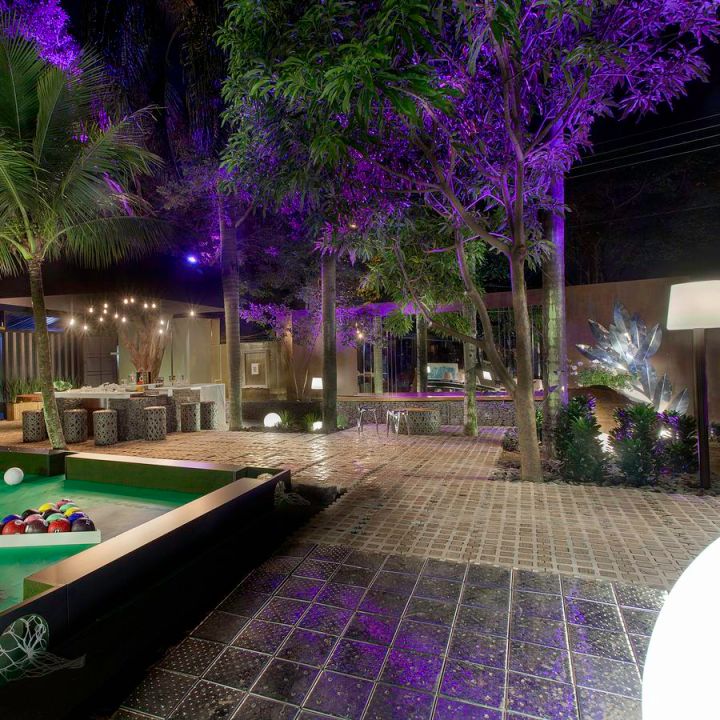 Um espaço para festas e muita diversão ao ar livre, onde o jardim já existente no local, as árvores frutíferas e os coqueiros ganham total valorização. Essa foi a proposta da arquiteta Áurea Monteiro, que assina este ambiente. Entre os destaques deste espaço estão alguns bancos e um bar, todos elaborados com sistema construtivo conhecido como gabião (pedras ensacadas em telas galvanizadas e encapadas com PVC). As pedras – basalto cinza– ficam aparentes e integradas a toda a natureza ao seu redor. Os móveis em fibra de vidro foram desenhados pela profissional e podem ficar expostos às intempéries. A luminotécnica foi desenvolvida para valorizar a vegetação e as copas das árvores. Outro destaque fica por conta da mesa de bilhar para jogar com os pés, de 35 m². As cores predominantes são verde, cobre, cinza e marrom.