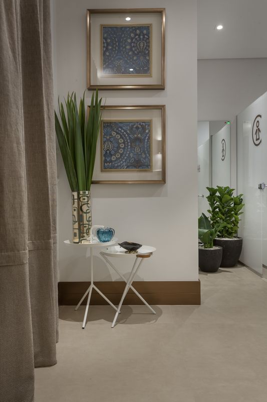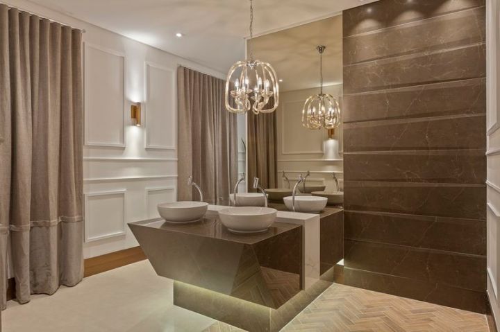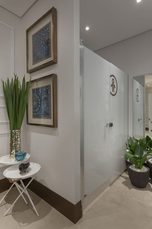 O ambiente de 25m² foi dividido em dois espaços para poder manter a privacidade do uso e a elegância do hall de entrada. Hall no qual as pessoas podem retocar maquiagem, utilizar as cubas ou até mesmo aguardar. A utilização do revestimento como ponto forte na decoração, em pisos e paredes e na própria bancada.