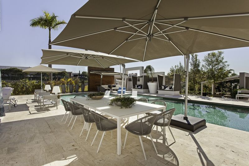 A Poltrona de Jantar Spade, com estrutura e pés palitos em alumínio branco e acabamento em corda sintética cinza, ganha destaque pelo design. A linha Spade ainda é composta por Lounge Chair, Sofá de 2 Lugares e Mesa de Centro em alumínio e vidro. Completando o ambiente, Mesas de Jantar Lisbon, em alumínio branco e tampo de vidro branco, e Ombrellones New Sombrano, quadrados com estrutura em alumínio natural e tecido cor Taupe. Ao fundo temos jogos de Poltronas de Estar Miami branco com Abajur-Vaso Door com luz LED.