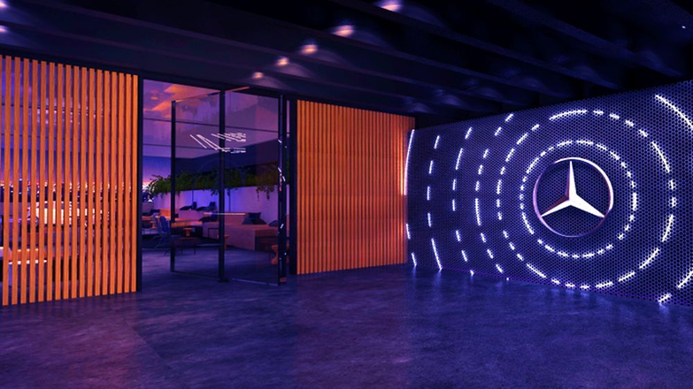 A iluminação o arquiteto conta com um sistema interativo que responde a inputs da emoção dos visitantes gerando uma simbiose com a marca e uma experiência de imersão extrema com o universo Mercedes-Benz. Essa inspiração veio de uma tecnologia apilcada ao modelo Classe E, equipado com faróis MULTIBEAM LED de alta resolução que, de forma automática, iluminam o caminho com uma distribuição de luz que não ofusca outros usuários da via.