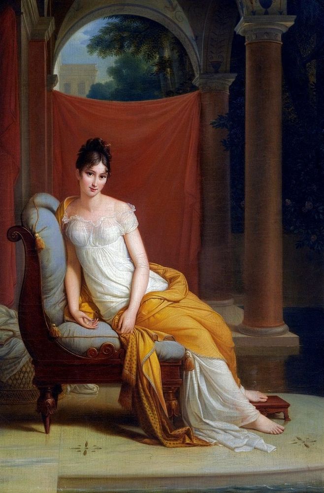 Juliette usou um vestido de algodão branco com braços quase nus, e cabelo curto “à la Titus”. O vestido inaugura o estilo Diretório – perfeita para a época que pedia linhas mais próximas ao natural.