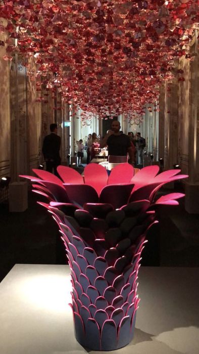 Louis Vuitton – Aconteceu no Palazzo Bocconi. Apresenta a coleção de objetos nômades inspirados em viagens. Vaso em couro patchwork em forma de pétalas dos irmãos Campana;