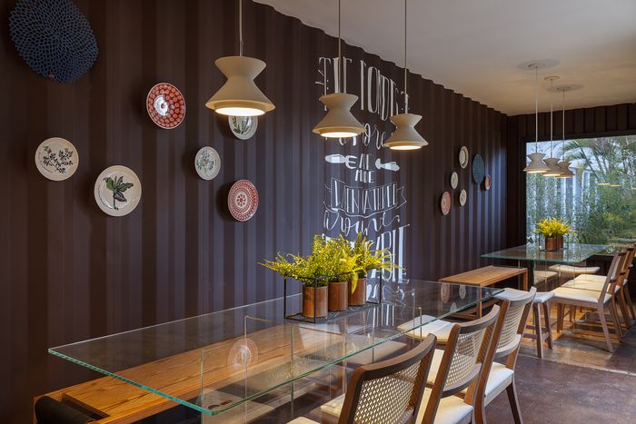 Característica da Arquiteta, a mistura de materiais como madeiras, ferro, MDF, mesas em vidro, tecidos naturais, aliado a marcenaria e móveis e objetos de design, além de arte nas paredes e jardim vertical imprimem personalidade ao ambiente, ao mesmo tempo sofisticado e aconchegante. Os equipamentos funcionais do gourmet são de última geração, e bancadas e paneleiros de inox foram executados sob medida. Luminárias pendentes em cerâmica se destacam.