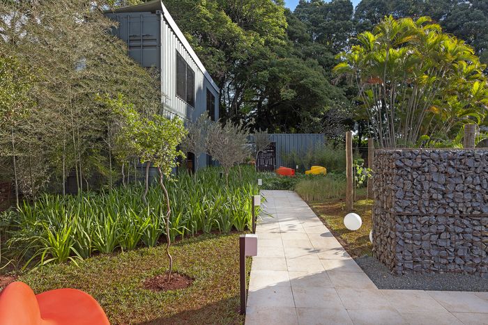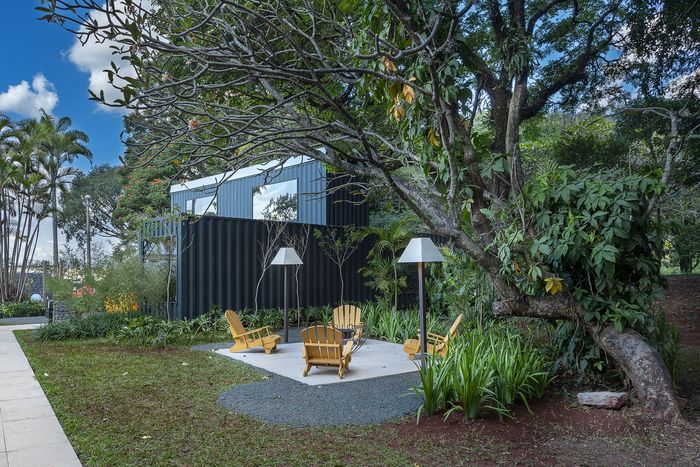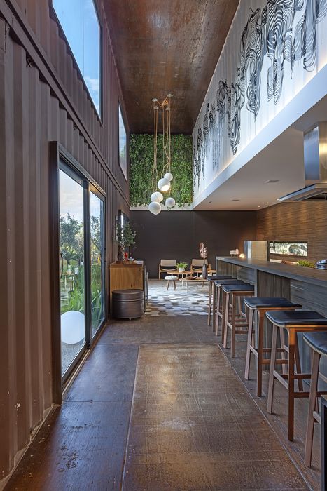 A utilização de quatro contêineres com grandes aberturas valorizando a paisagem e a utilização de pé direito duplo reforçam o conceito de apresentar novas soluções e propostas inusitadas, pois o piso de um dos contêineres, invertido sobre outro, faz a função de forro.