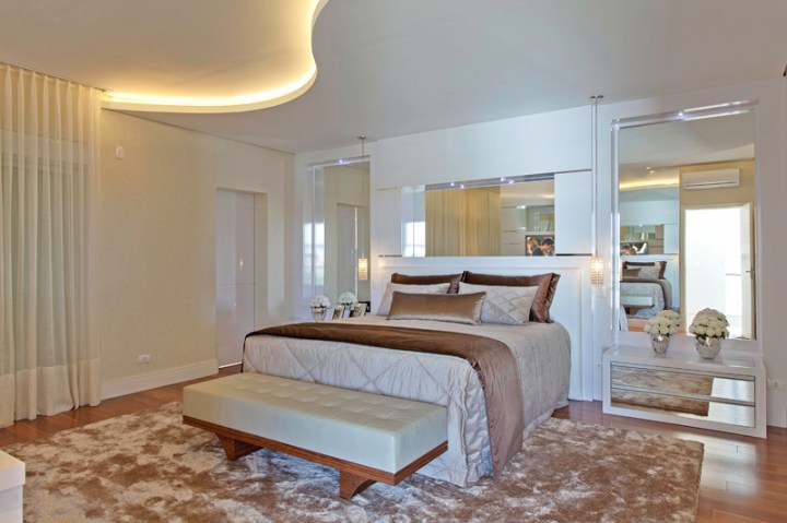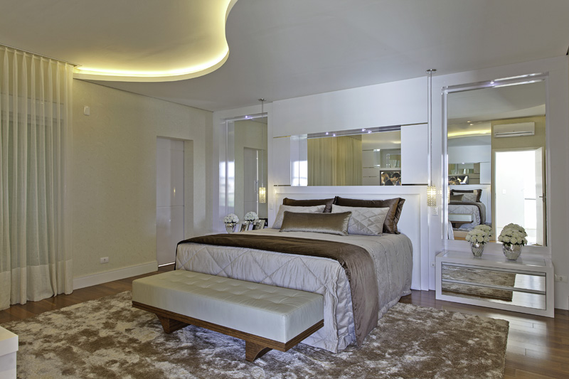 Descendo dois lances de escada, encontramos o home theater, projetado com vista a área de lazer. Além do sofá, o ambiente possui um painel de espelho com tv embutida e um móvel com formato orgânico que acomoda os aparelhos eletrônicos. Ao subir a escada em forma de “S”, encontramos um mezanino responsável pela distribuição das três suítes do imóvel, idealizadas para refletir a personalidade de cada um dos moradores da casa.