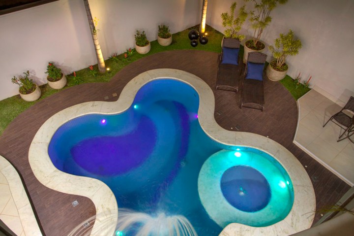 A cozinha é reservada da área social e possui ligação direta com a área de lazer, que é um espaço completo. Além do belo jardim, o lazer é composto pela piscina em formato orgânico com cascata saindo da laje e espaço gourmet – churrasqueira, fogão, pia de trabalho, bancada de refeição, banquetas e mesas de apoio – com acabamentos que mesclam o rústico com o contemporâneo.