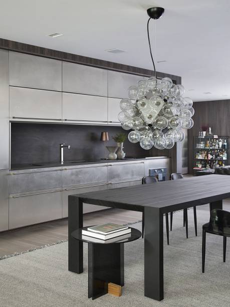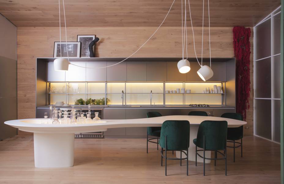 Nildo José traz para a cozinha do Loft Ninho o desenho arquitetônico que valoriza a estética do Jockey, com uma estrutura que não interfere nos elementos originais. O desenho é sublinhado pela iluminação com fitas de LED. Peças com assinatura de Jean Prouvé e Oscar Niemeyer estão entre os poucos e bons itens que compõem o mobiliário. Destaque para a grande mesa de linhas curvas e suaves que compõem o espaço e foi desenhada pelo próprio profissional.