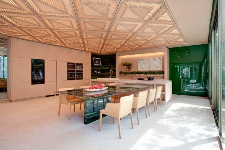 No Le Riad Bontempo, Roberto Migotto usa a inspiração marroquina para apresentar uma cozinha ampla, na qual o tom de verde nas paredes chama a atenção. Os móveis fixos enaltecem as linhas retas e a praticidade. O grande painel de madeira entalhada que reveste o teto é assinado com o sócio Ricardo Minelli.