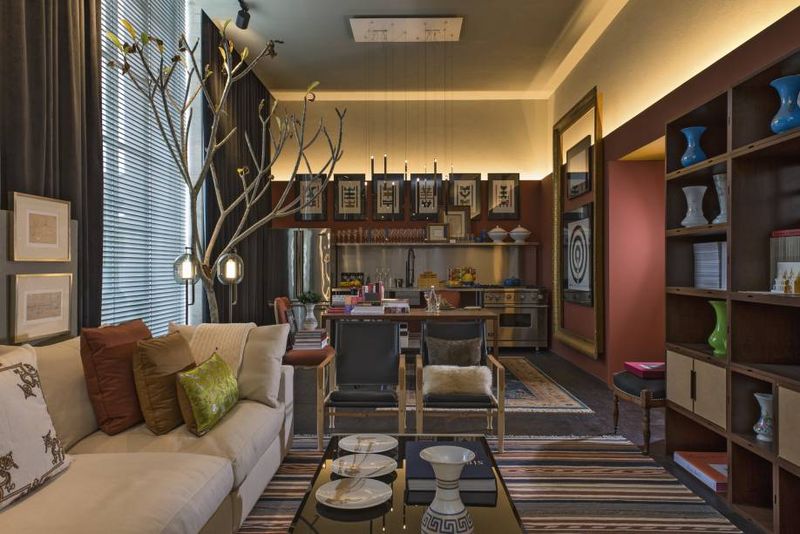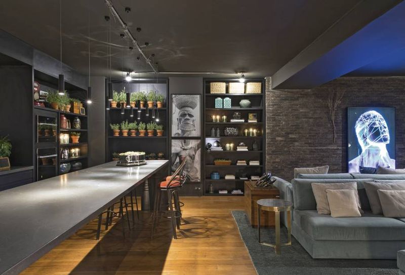 Michel Safatle, em seu Loft Eu + Tu + Elas, aposta na iluminação, nos tons terrosos e azuis – além de diversos objetos – para compor um décor que favorece a intimidade e a convivência. Além disso, a premissa do loft de 125 m² é a integração. Os ambientes se conectam, mantendo reservados apenas a sala de banho e o closet, em um único anexo isolado por paredes.