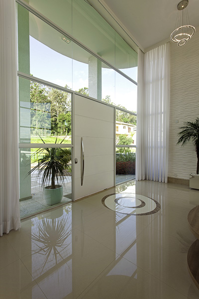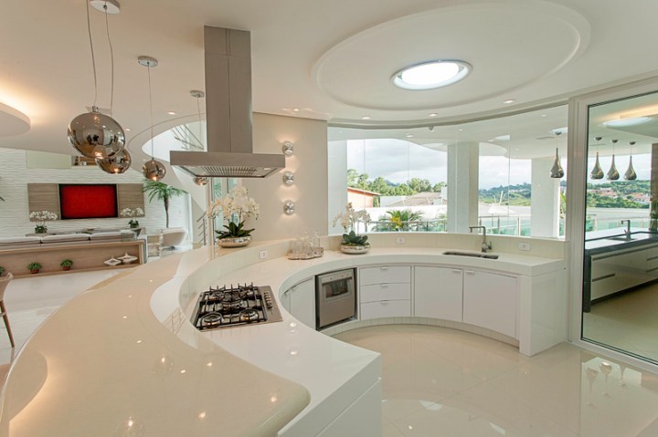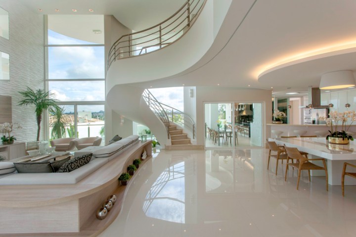 O imóvel possui elevador, um sistema de aspiração central e uma ampla área social e seis suítes. O living – com pé direito duplo – a sala de jantar e a cozinha estão integrados. Uma bancada de refeições separa a cozinha dos outros ambientes. Com decoração na cor branca e em tons pastel marcam as escolhas do mobiliário e revestimentos.