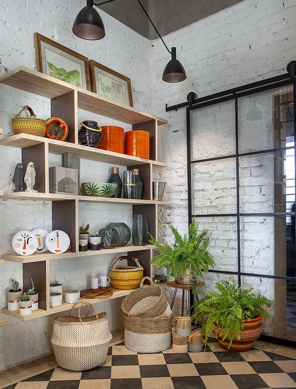 O projeto luminotécnico se utiliza luminárias de design led, com instalações e suportes aparentes. Foi adotada uma estética industrial, visando eficiência na iluminação dos objetos e economia na energia utilizada. Materiais como compensado laminado de pinus, ferro e sobras de ladrilho hidráulico, MDF reutilizados de outras mostras, foram usados para o mobiliário da loja, desenhados por Stella. A diversidade dos objetos expostos na nossa loja pede um fundo neutro, mínimo e confortável. A proposta adotou referencias de estilo industrial escandinavo.
