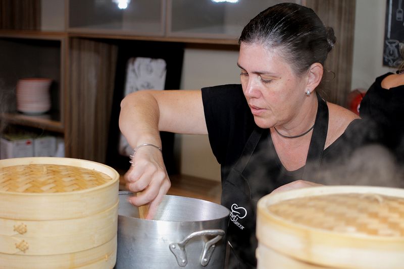 A chef Fernanda Antunes e sua sous chef Maria Eugênia Sartori apostoui no Machhalee, que é moqueca tamboril no perfume de ervas, camarões e caldo de moqueca. Para sobremesa, Naariyal kaindee, que é doce de côco e coulis de frutas amarelas.