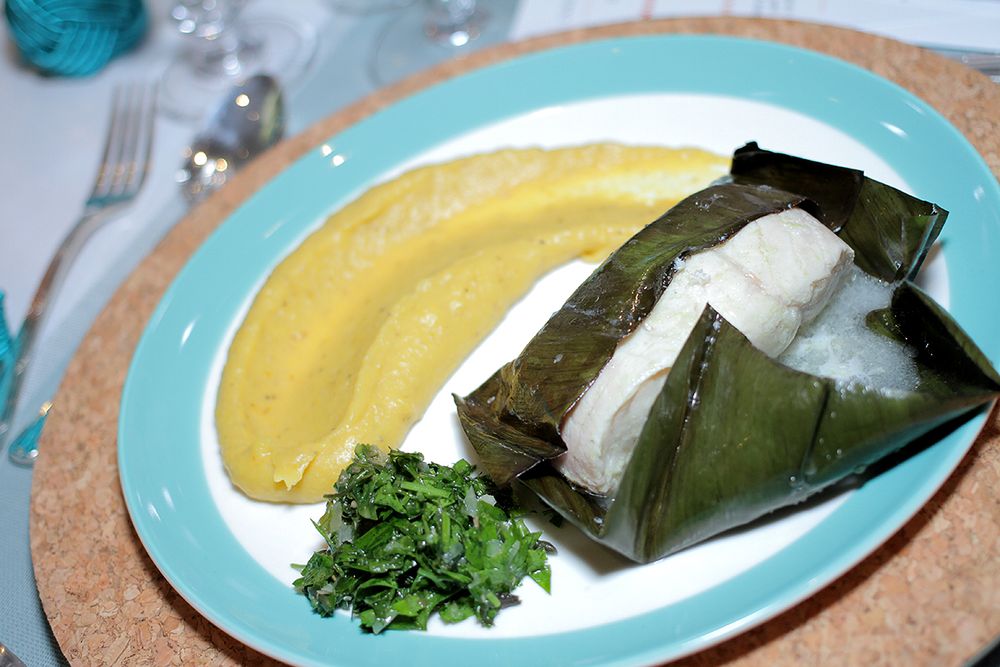 Ao lado de Juliana Milhano, Mariana Oliva preparou o peixe Filhote em folha de bananeira, purê de banana da terra e molho frio de hortaliças. Para a sobremesa, foi servido Cocada de tabuleiro com calda de tamarindo.