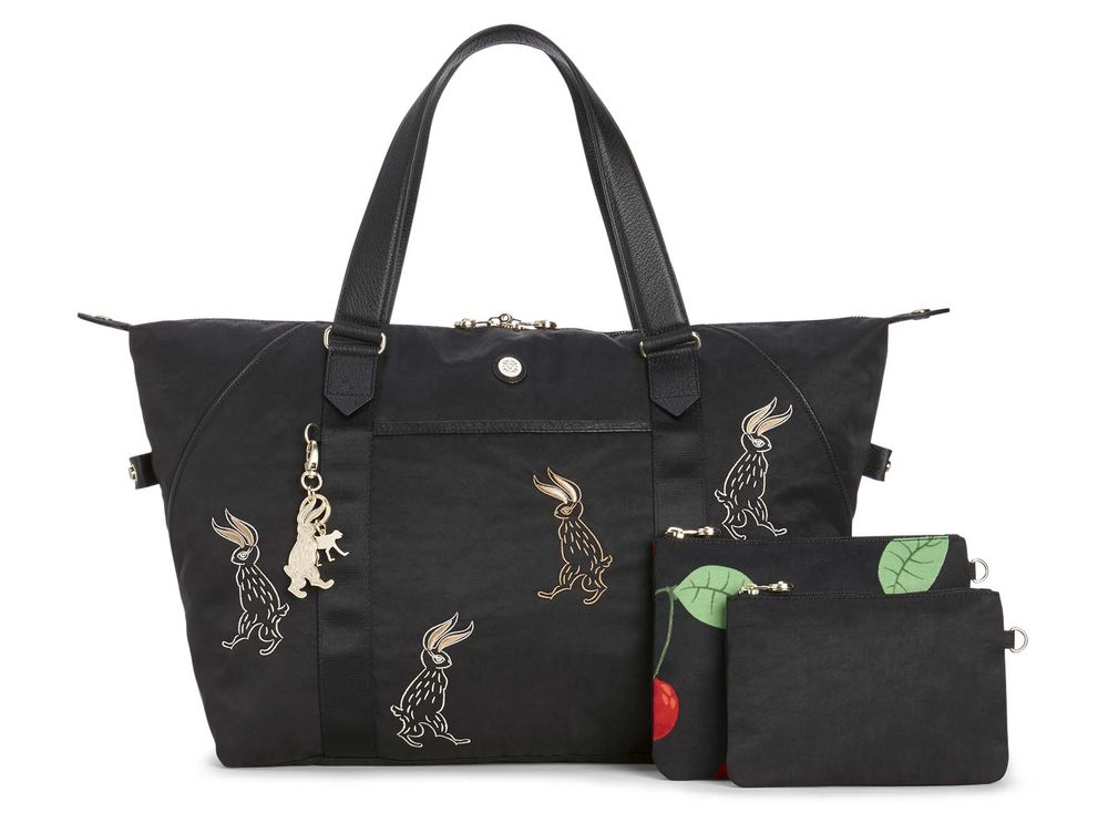 A estampa escolhida é de coelhos. Ela chega no fundo preto com os protagonistas bordados em fios brancos e dourados. O detalhe fica por conta do chaveiro em formato de coelho, que convive harmoniosamente com o monkey charm metalizado.