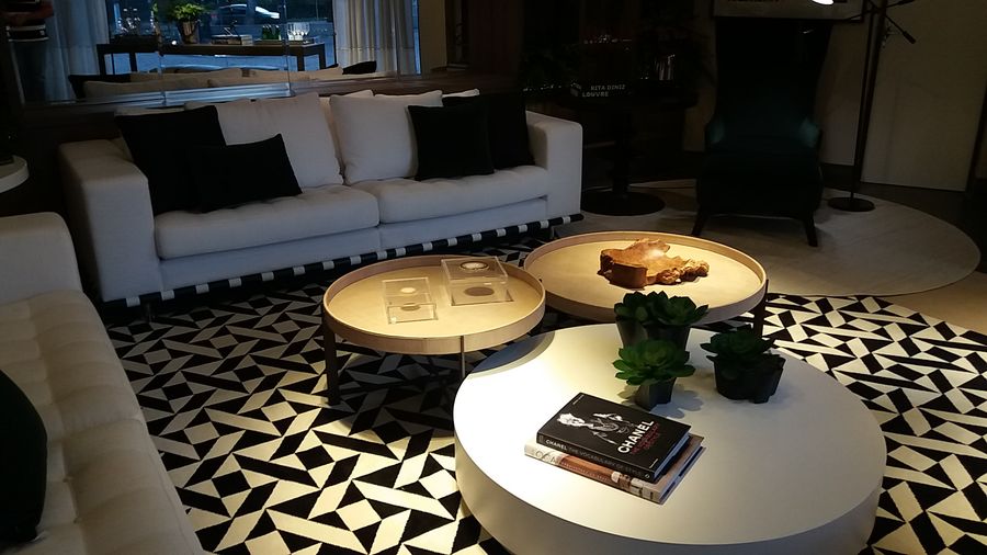 Os espaços foram ambientados com peças da Artefacto marca e outros parceiros como Lucia Freitas, tapetes Saint German, iluminaçao da Vertz, jardim da Vertical Garden e papel de parede da Decorações Casarão.