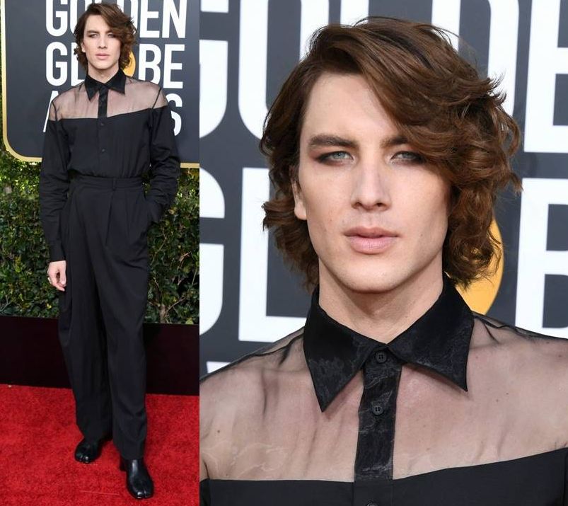 Apostando na androgenia, Cody Fern, astro de American Horror Story Apocalipse usou um ousado Maison Margiela com direito a camisa transparente. Amei a make nos olhos.