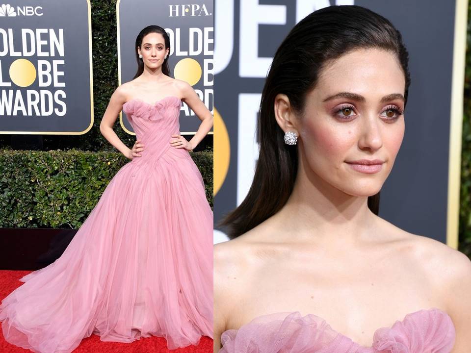 O mesmo tecido foi a aposta de Emmy Rossum num ‘petal pink’ Monique Lhuillier drapeado. Não é qualquer estilista que acerta o drapeado na organza sem parecer figurino de Frankstein.
