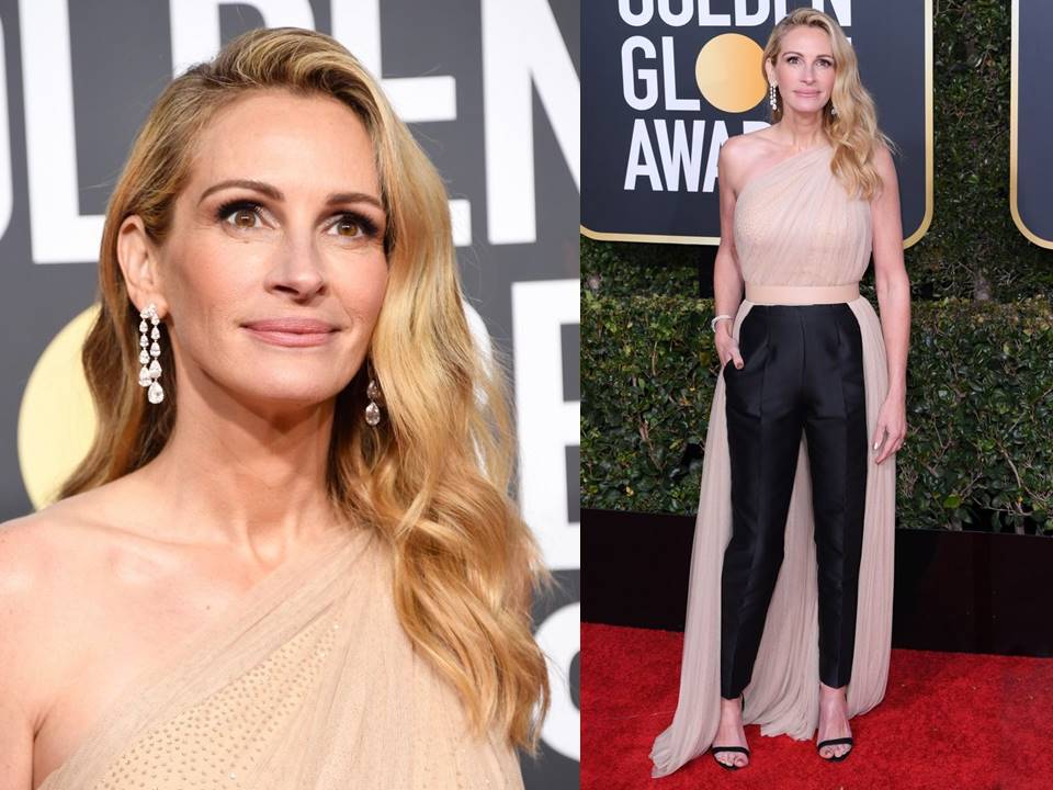 Fugindo do seu mau gosto habitual, Julia Roberts acertou no Stella McCartney de tule de seda de um ombro só com calça de Smoking preto. É seu melhor momento no Tapete Vermelho em anos.