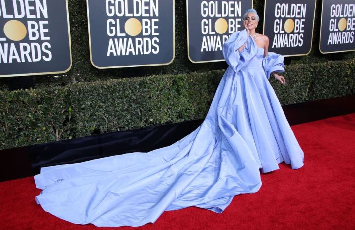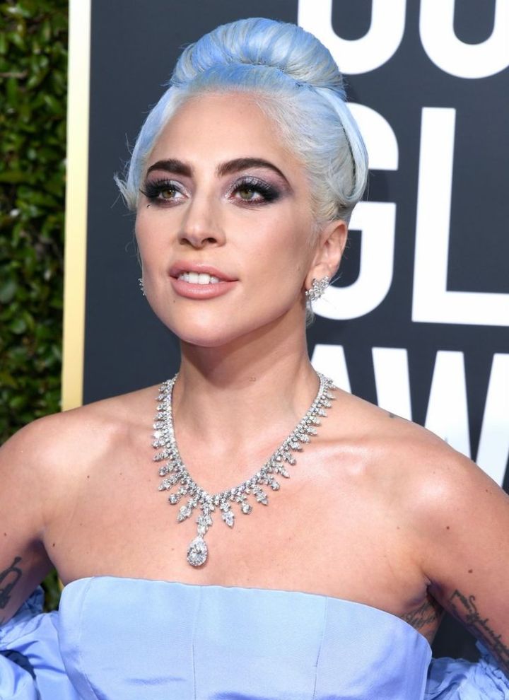 Cercada de expectativas, Lady Gaga surgiu num volumoso Valentino Couture Pervinca (ou azul lavanda) com botas Giuseppe Zanotti e joias com diamantes de 100 quilates Tiffany & Co. Ela combinou com a roupa com a cor do cabelo.