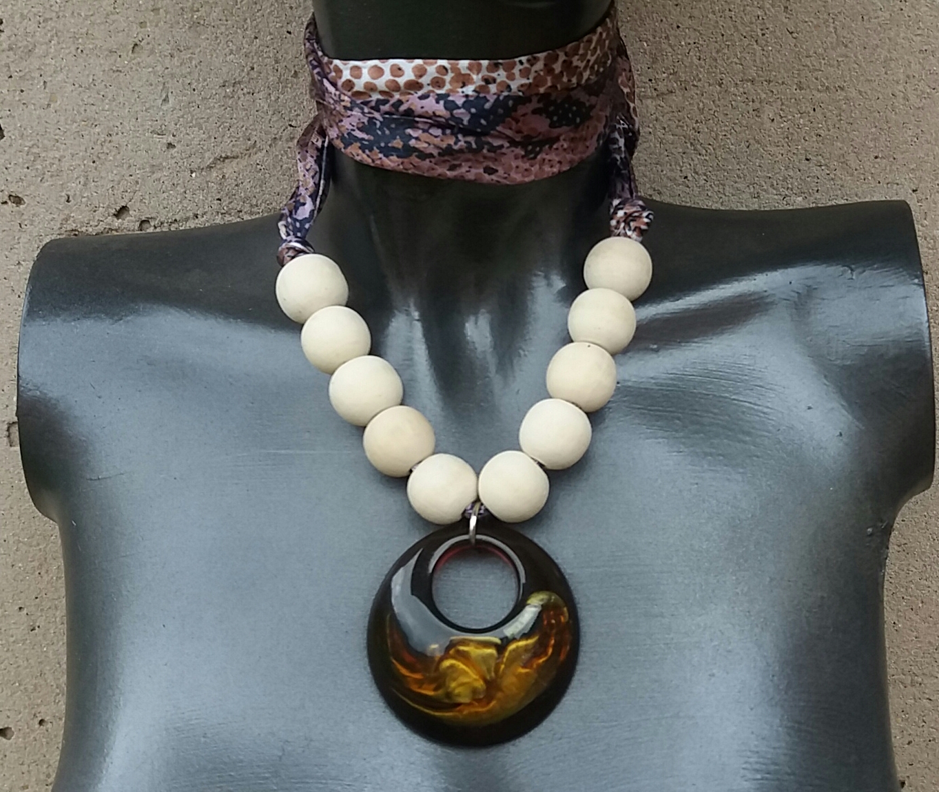 FOJQFCódigo37-Colar no lenço de cetim Animal Print com Resina e Madeira off-white