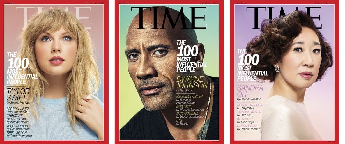 Sandra Oh (Killing Eve), Dwayne Johnson, Taylor Swift, Gayle King (apresentadora de TV), Nancy Pelosi (Presidente da Câmara dos Representantes dos EUA) e Moharmed Salah (jogador de futebol egípcio) são as estrelas da seis capas da revista Time com a lista das 100 pessoas mais influentes no mundo em 2019.