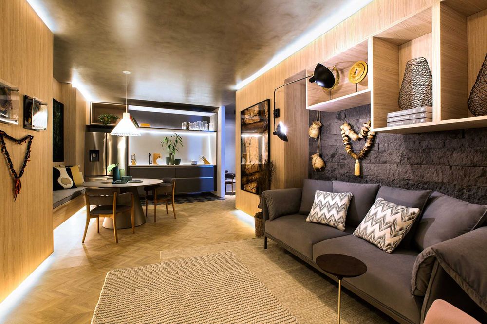 Mi Casa, Su Casa By Leo Sob Medida – A designer de interiores e produtos Gal Nunes buscou criar um apartamento aconchegante com estilo contemporâneo e moderno. Projetou um layout no qual fosse possível integrar ambientes, potencializando a convivência, e escolheu acabamentos de alta tecnologia e sustentáveis. Ressaltando o bem estar, usou linhas retas e cores neutras acompanhadas de muita textura, característica marcante no ambiente que originalmente possuía 62 m2 e foi ampliado com a ajuda de um contêiner marítimo, em uma obra limpa, econômica e rápida, totalizando 92 m2.