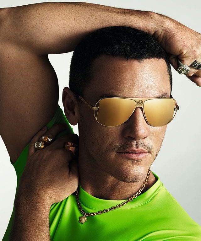 Luke Evans é a estrela da campanha 2019 dos óculos solar e receituário da Versace, destacando as armações em metal com uma chave grega gravada a laser abrangendo toda a armação, enquanto os rebites de Medusa adornam as pontes e as ponteiras das hastes.