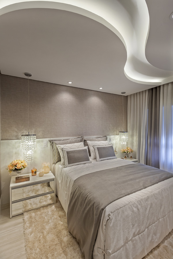 A área social é ampla e aberta. A decoração de interiores integrada e possibilita às pessoas que estão no living contemplarem a cozinha e a varanda, que foi transformada em sala de jantar. Na sala de estar chamam atenção as sancas circulares no gesso do teto que emolduram o lustre de cristal. Os espelhos acima e na lateral da TV e na porta de acesso a área íntima dão profundidade e valorizam o ambiente com o lindo efeito causado pelo reflexo da iluminação.