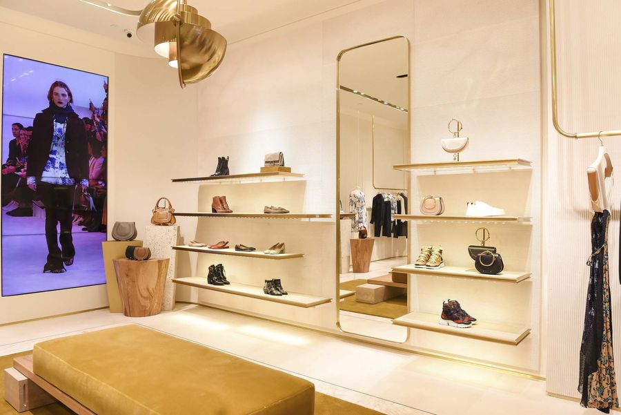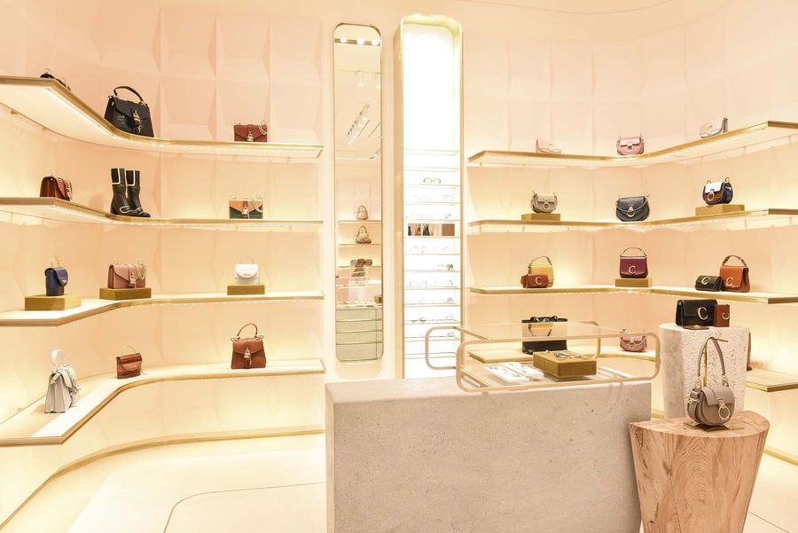 Além das roupas, os calçados dispostos sobre prateleiras que flutuam em paredes de gesso. Os dois provadores da loja encontram-se atrás de portas deslizantes espelhadas. Os acabamentos do espaço são influenciados diretamente pela identidade Chloé e se refletem nos materiais nobres e naturais, nas formas curvilíneas e nas cores em tons de bege róseo, marfim e mostarda quente usado nos revestimentos de veludo. Pontos de dourado escovado e polido ajudam a iluminar o espaço.