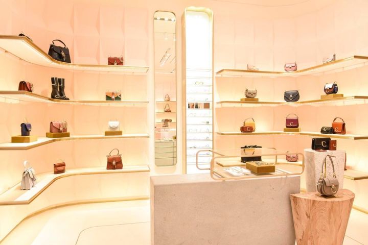 A fachada conta com duas portas de vidro amparadas por duas grandes vitrines onde destacam-se manequins suspensos sobre pódios feitos de pedra, de madeira e de metal, assim como as paredes 3D geométricas. O primeiro ambiente da loja abriga parte da coleção de acessórios Chloé — bolsas, pequenos artigos de couro, óculos e joias — que repousam sobre prateleiras de latão dourado escovado alinhadas às paredes em rosa.