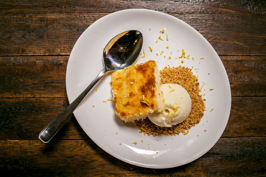 Fechando as delícias, salada de frutas da estação, cocada de forno com sorvete de limão e farofa de coco queimado ou sacher de damasco com calda de rum, cobertura de chocolate e farofa de brownie com caramelo.