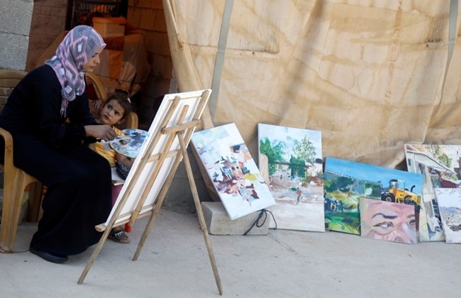 A artista, de 37 anos, afirma que tenta expressar seu medo e incerteza através de pinturas, entre elas uma aquarela representando mulheres reunidas em torno de uma casa demolida e a cena de uma escavadeira amarela se aproximando de uma cabana beduína.