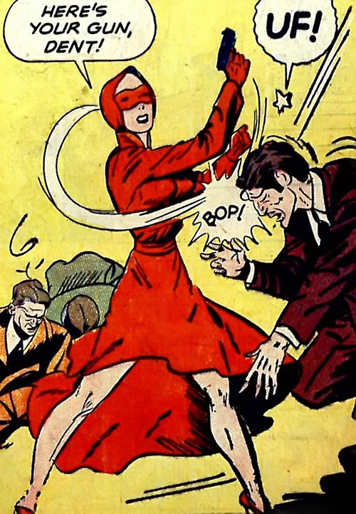 Ela era a identidade secreta da policial Peggy Allen, que surgiu da frustração das limitações do seu trabalho. Como The Woman in Red, ela usou capa, capuz e máscara vermelhas.