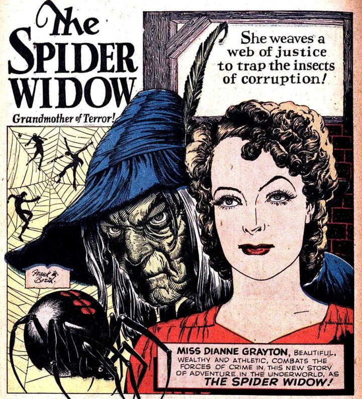 Criada por Frank Borth, Spider Widow debutou na revista Feature Comics #57, em junho de 1942. Identidade secreta da atleta Dianne Grayton, que decidiu combater criminosos e espiões estrangeiros depois que descobriu o poder de controlar aranhas Viúva Negras. Poderes nunca explicados nos quadrinhos.
