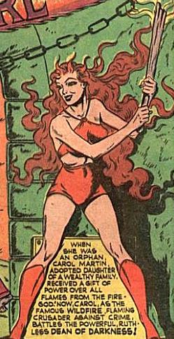 Criada por Jim Mooney, Wildfire apareceu pela primeira vez no gibi “Smash Comics” #25 (1941) como a órfã que foi salva de um incêndio pelo deus do fogo, que lhe concedeu os poderes sobre as chamas.
