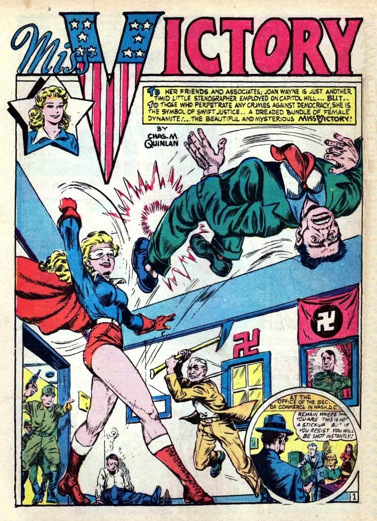 Criada por Charles Quinlan, Miss Victory era o alter ego da secretária e estenógrafa Joan Wayne, que trabalhava para um departamento do Governo. Ela era assistente do Dr. Mark Benton do Projeto Colorado, que desenvolveu um composto químico chamado V-45 com a proposta de criar super soldados.