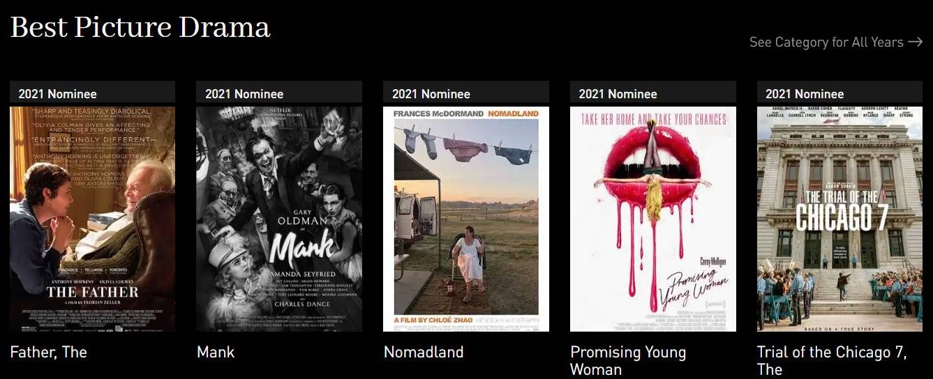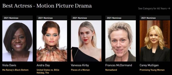 Pela primeira vez em seus 78 anos de história, a Associação de Correspondentes Estrangeiros em Hollywood indicou três mulheres na categoria de Melhor Direção: Regina King (Uma Noite em Miami), Chloé Zhao (Nomadland) e Emerald Fennell (Bela Vingança) para o Globo de Ouro 2021.
