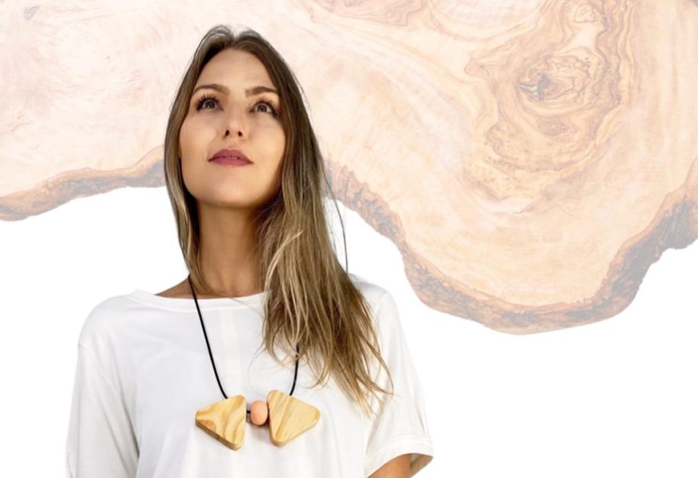 As biojoias feitas com madeiras sustentáveis assinadas pelo designer Jorge Marcelo Oliveira completam os lindos e confortáveis looks da loja de roupas femininas localizada próximo à Torre do Castelo.